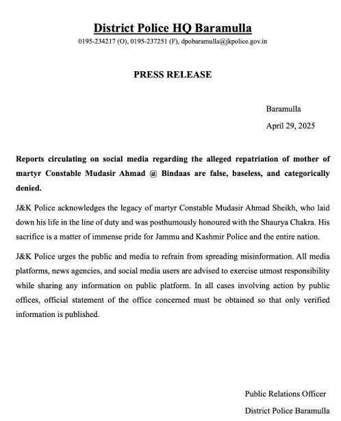 Baramulla, April 29: District Police Headquarters Baramulla has strongly denied reports circulating on social media regarding the alleged repatriation of the mother of martyr Constable Mudasir Ahmad @ Bindaas, terming them as “false, baseless, and categorically denied.”